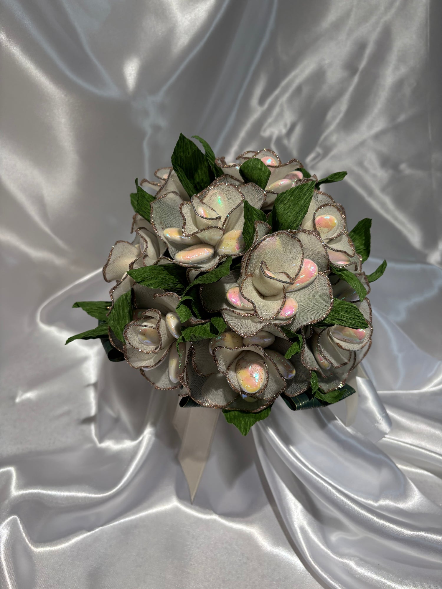 This bridal bouquet has nine ivory roses all handcrafted one by one then adding a touch of glitter to enhance its beauty. Beautifully arranged with greenery is completing the bouquet, perfect for that special day.