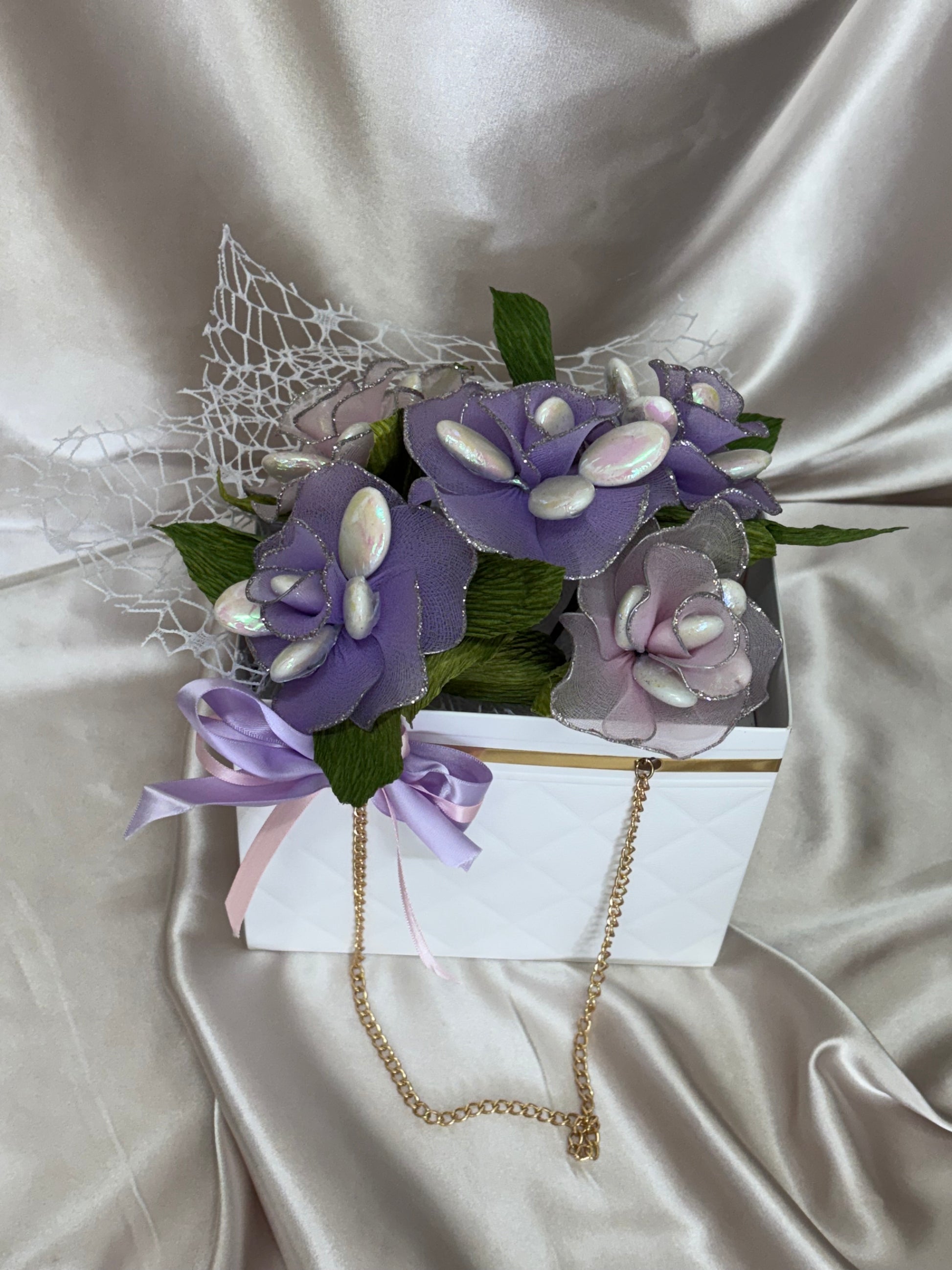 This luxury Handbag arrangement has pale pink and purple flowers. These colours symbolise a blend of passion, romance, and sophistication, together with ambition and power.