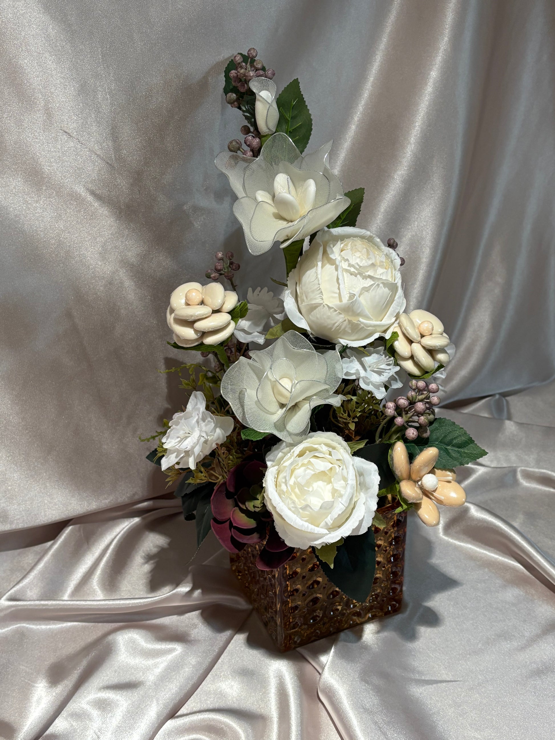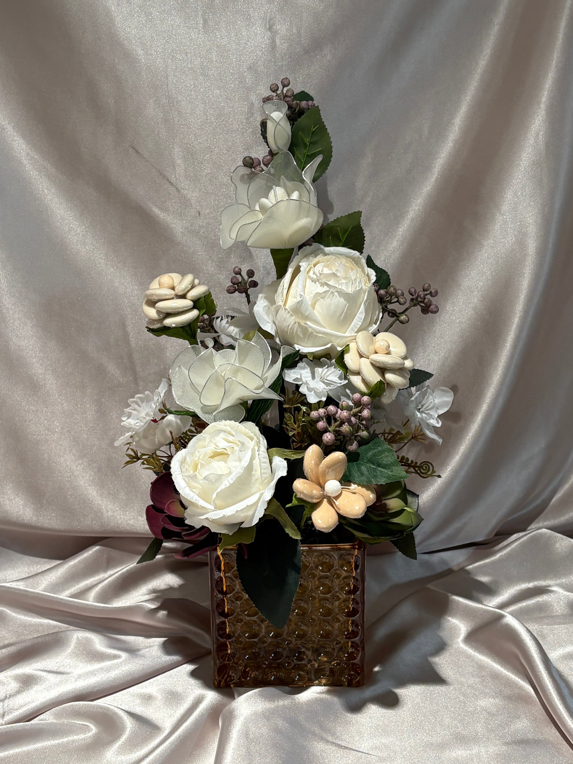 This bubbled amber glass vase features a mix of white and cream artificial flowers, including large peony-like blooms and delicate fabric petals, along with some beige ceramic-like flowers and small clusters of purple berries. The leaves are dark green, complementing the soft, neutral tones of the flowers. The overall composition is balanced and graceful, suitable for decorative purposes or a formal display.
