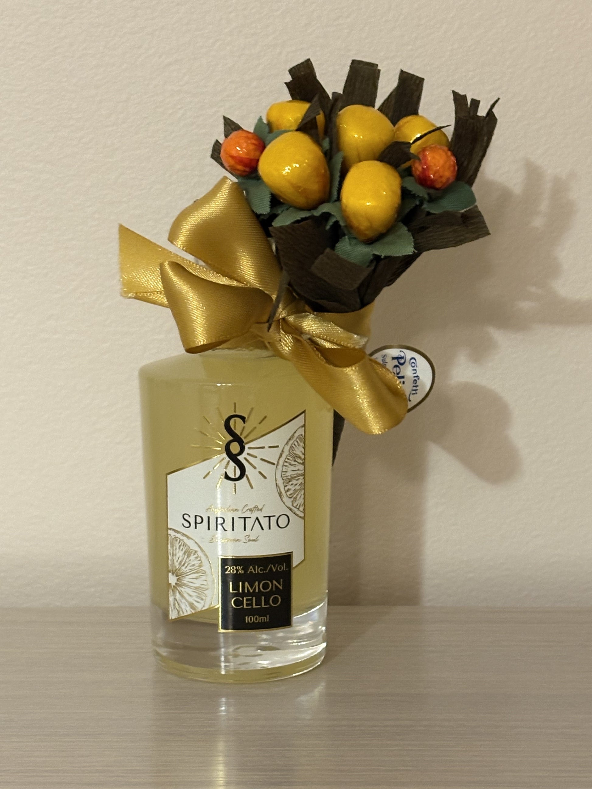 A small bottle of Spiritato Limoncello from South Asutralia with a branch of lemon made from sugared coated almonds is the perfect favour for any occassion.