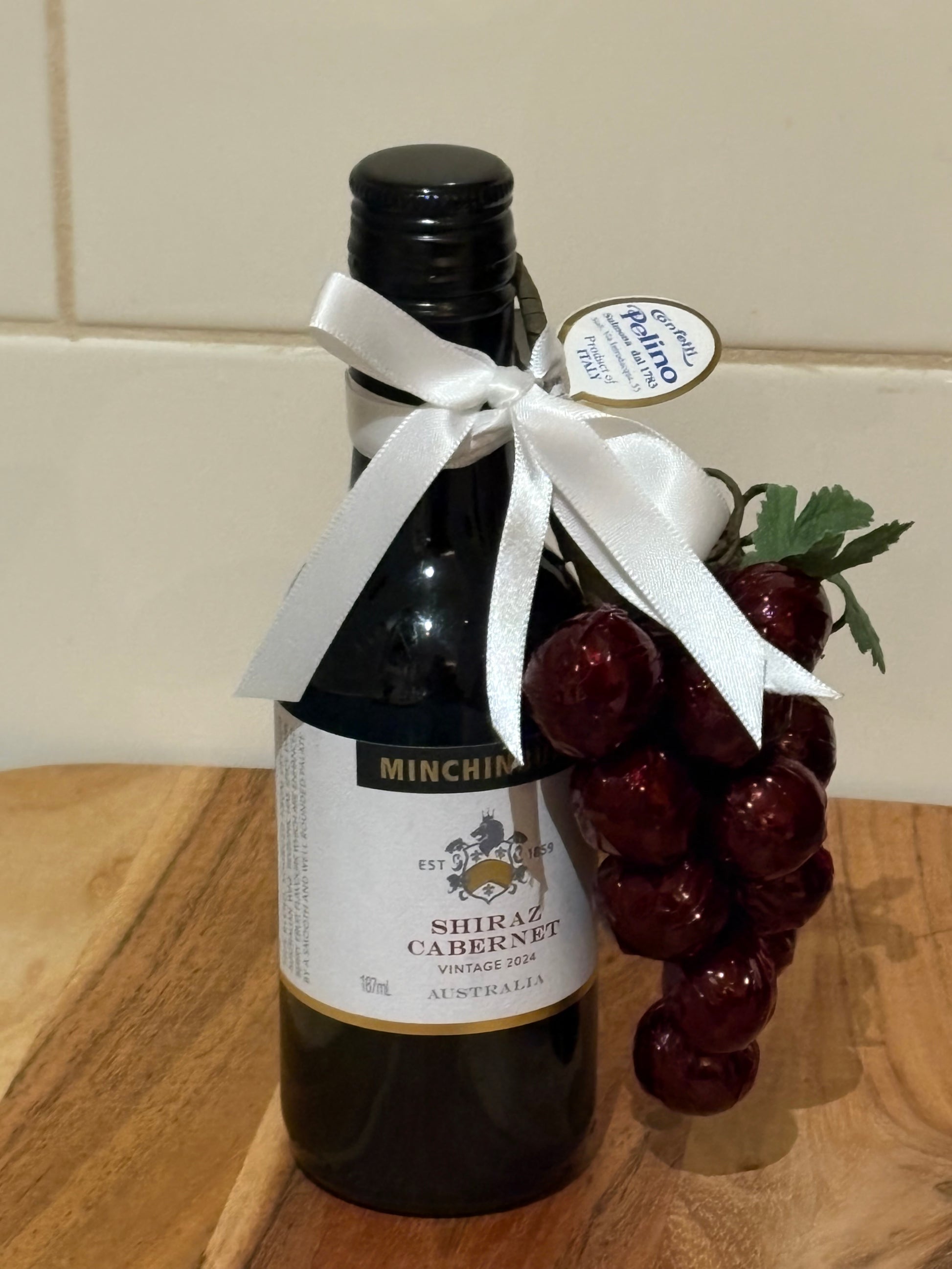 A small bottle of red wine decorated with a white ribbon tied around the neck with decorative bunch of grapes made from sugared coated almonds.