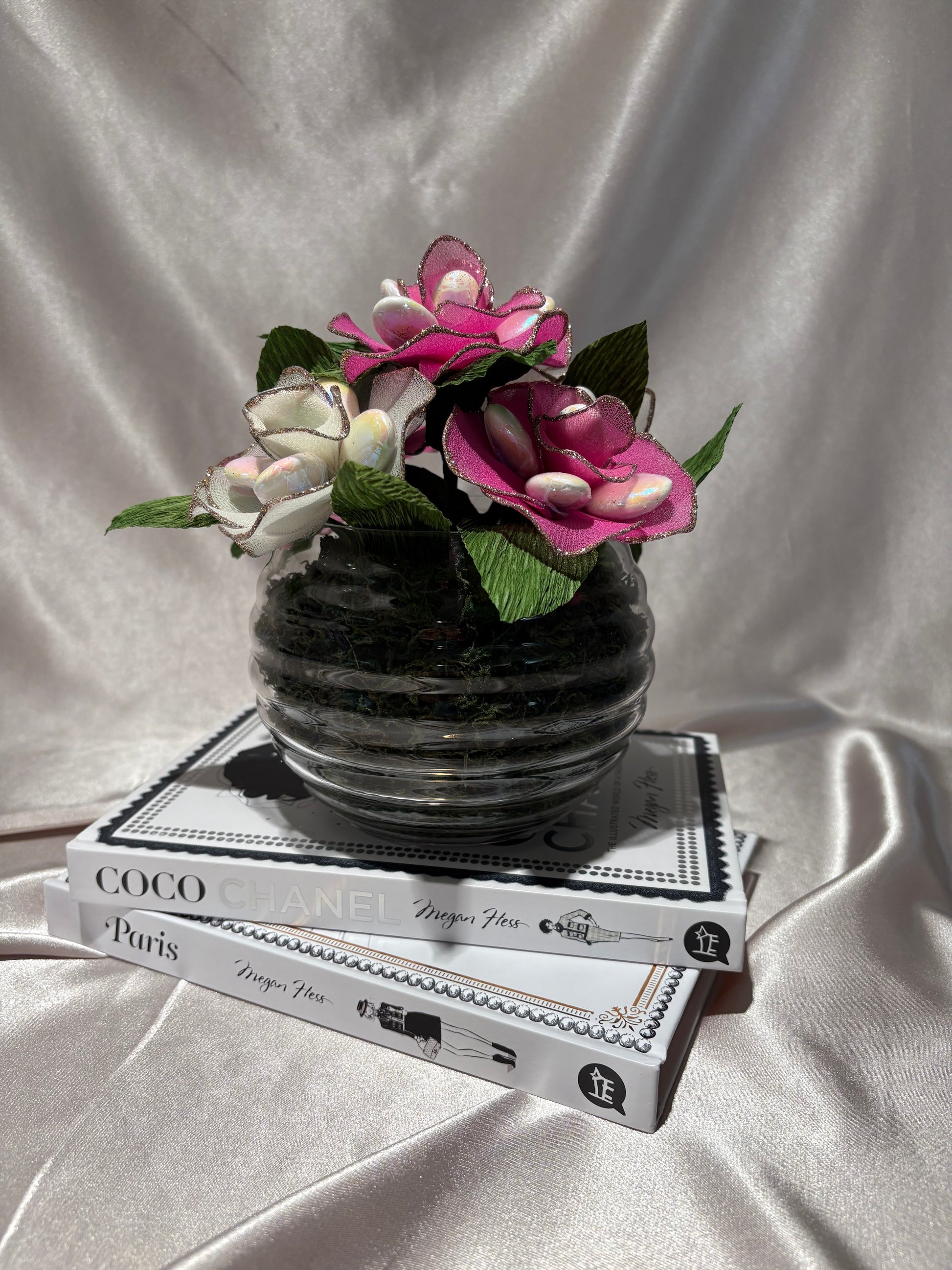 New beginnings and brighten someone day, this fuchsia and ivory arrangement symbolises grace, elegance, love, and friendship, along with qualities like confiding love, amiability, and good taste. Vibrant glass bowl conveys confidence, creativity, joy and often can be gifted to celebrate milestones, particularly in events emphasizing celebration, joy, and new beginnings. Books are for display purpose only and not included.